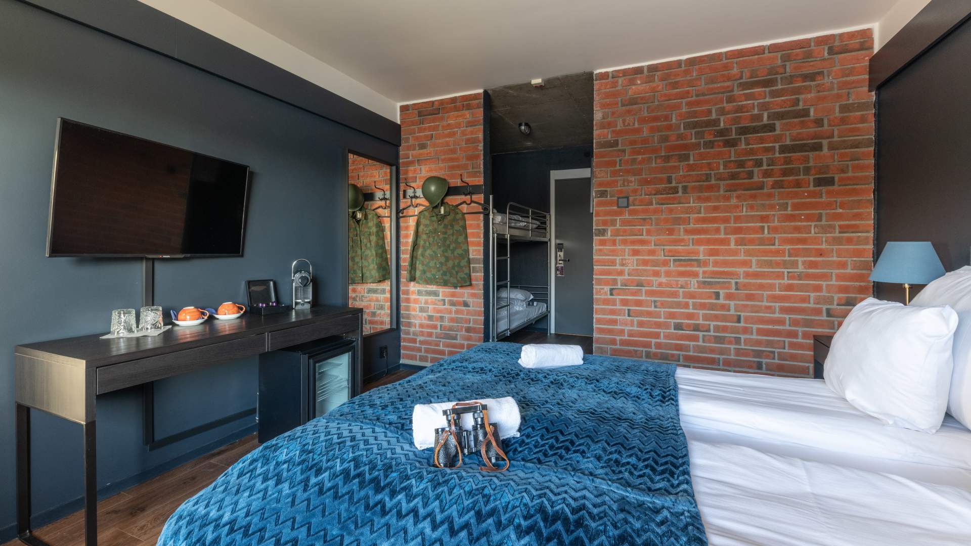 In addition to a comfortable double bed, the family rooms have military bunk beds, where soldiers have marked their presence by writing their surnames on the concrete walls.