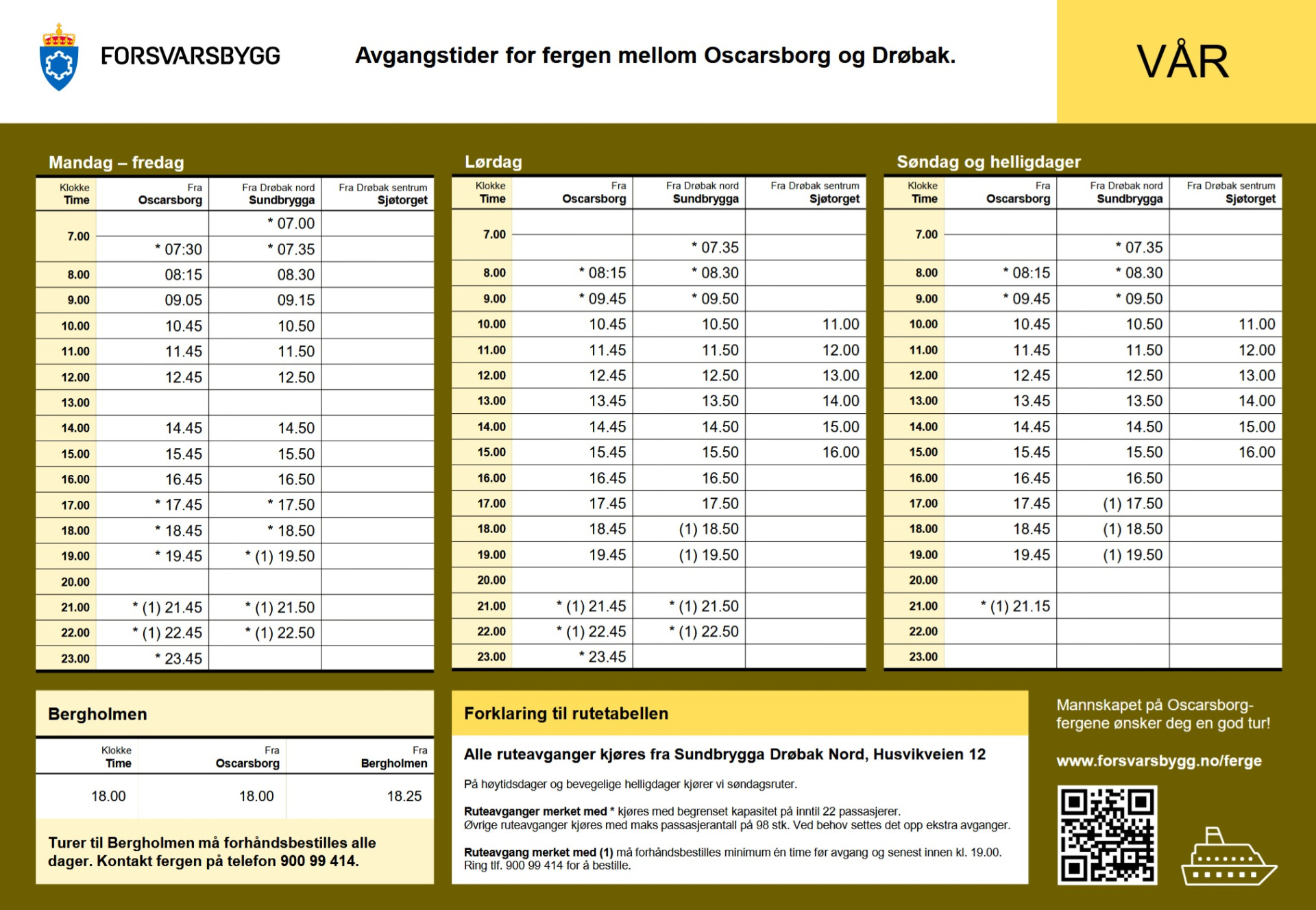 For mer informasjon om ferge, inkludert oppdatert tidtabell, se denne siden til Forsvarsbygg, alternativt denne siden Visit Greater Oslo.